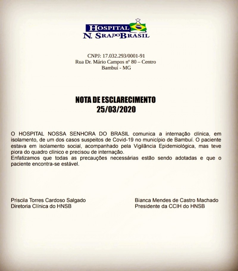 O Hospital Nossa Senhora do Brasil publicou nesta quinta-feira (26) um informativo comunicando a internação clínica, em isolamento, de uma mulher, de idade não informada, que apresentou sintomas do COVID-19.