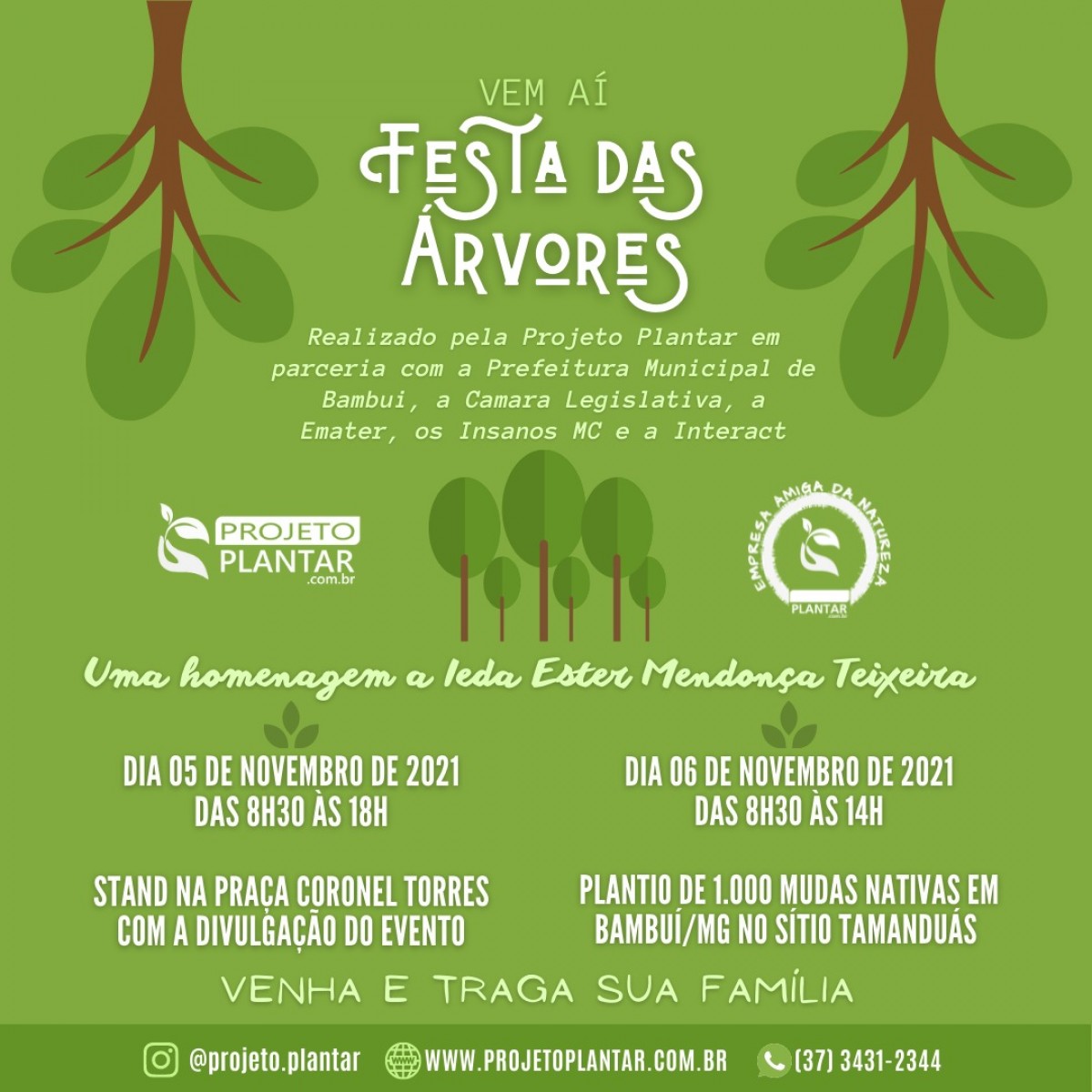 No dia 06 de novembro de 2021, a Projeto Plantar com o apoio da Prefeitura Municipal de Bambuí, Câmara Legislativa, Emater, Insanos e Interact estará realizando a Festa das Árvores. Nosso objetivo é realizar o plantio de 1.000 mudas nativas em 24 horas, em Bambuí-MG. O início será às 8h30 no sítio Tamanduás apenas 8km da cidade, e convidamos a todos de Bambuí e região para participar, leve seu filho, pai, mãe, namorado, marido, esposa e amigos , para realizarem o plantio de mudas nativas juntos, enraizando o sentimento de amor para quem esteja participando e também criando laços com o Meio Ambiente. O projeto é também uma homenagem a Iêda Ester Mendonça Teixeira, por sua luta há 40 anos em defesa das questões ambientais.