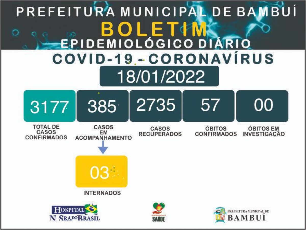 A Prefeitura de Bambuí, por meio da Secretaria Municipal de Saúde, em parceria com o Hospital Nossa Senhora do Brasil, divulgou nesta terça-feira (18), mais um boletim epidemiológico diário sobre os casos de Covid-19 no município. Infelizmente o município registrou um novo óbito em decorrência da Covid-19.