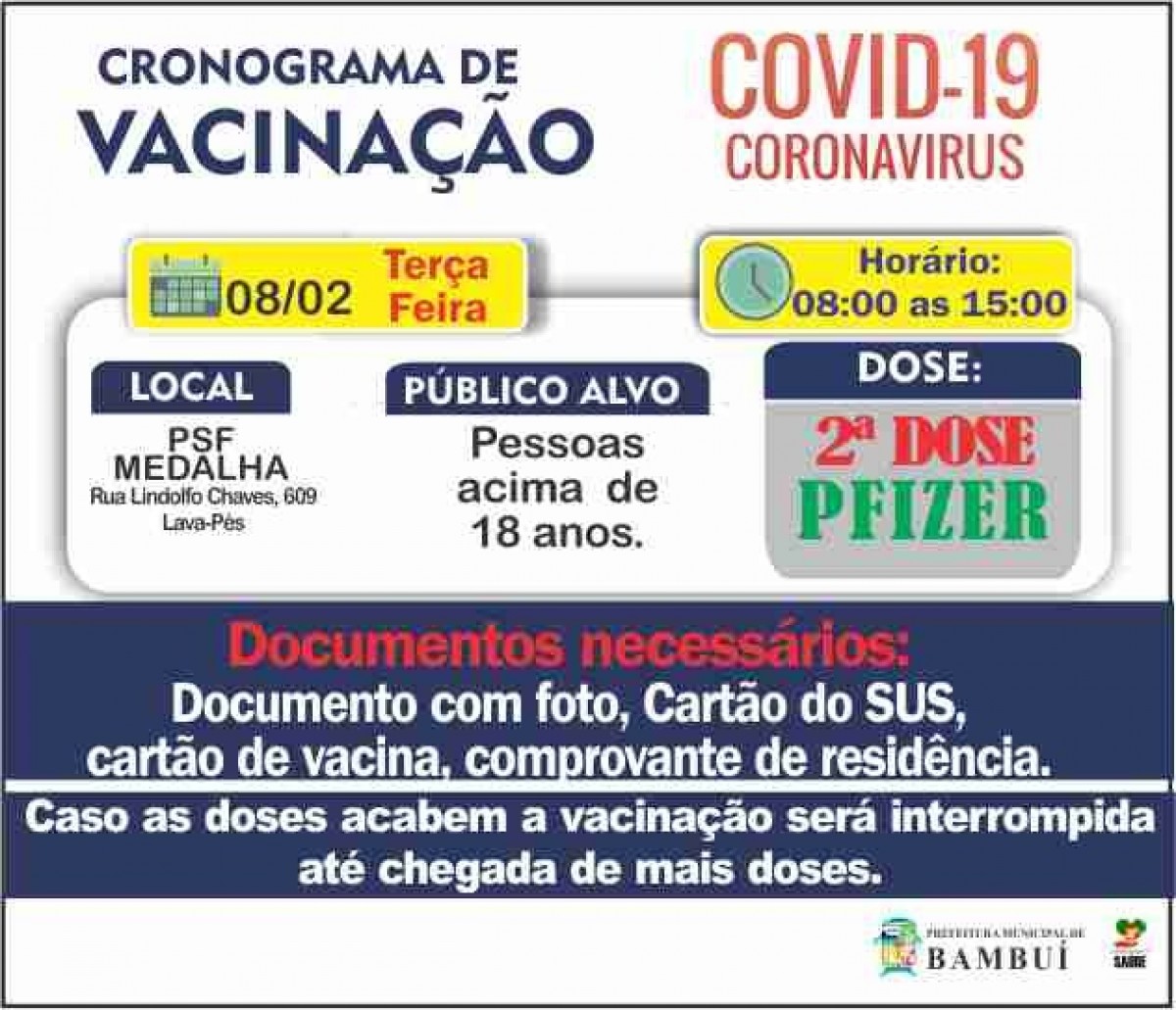 Segunda dose da Pfizer para pessoas acima de 18 anos em Bambuí