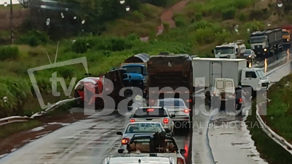 Conforme apurado pela TV KZ, na imagem é possível ver um caminhão baú que ficou atravessado na pista, quando outro caminhão tentou desviar e acabou tombando. Chovia no momento do acidente.