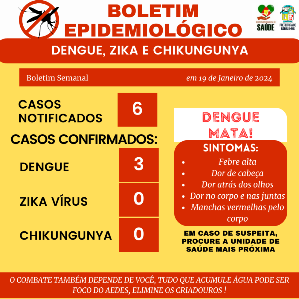 Então bambuienses, é preciso ficar atentos e espertos para evitar o aumento de Aedes aegypti, de insetos e de pernilongos para que o Município não tenha uma epidemia de Dengue, Zika ou Chikungunya.