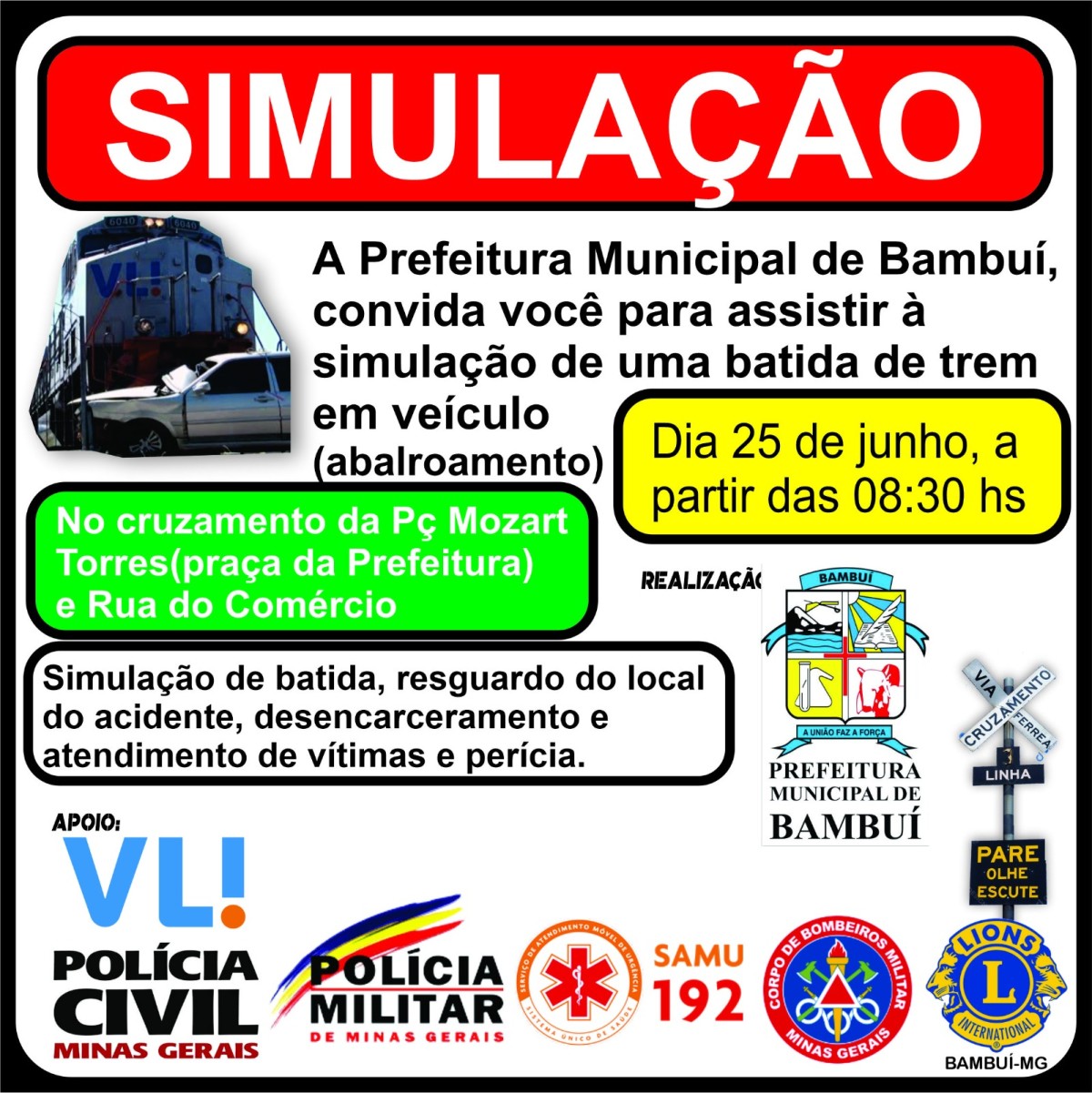 Acontecerá na manhã desta terça-feira (25), a partir das 08h30, no cruzamento da linha ferrea da praça Mozart Torres (Praça da Prefeitura), uma simulação de acidente de trânsito envolvendo uma locomotiva e um veículo de passeio.