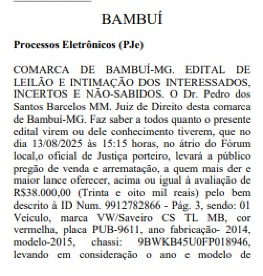 O Dr. Pedro dos Santos Barcelos MM. Juiz de Direito desta comarca de Bambuí-MG. Faz saber a todos quanto o presente edital virem ou dele conhecimento tiverem, que no dia 13/08/2025 às 15:15 horas, no átrio do Fórum local,o oficial de Justiça porteiro, levará a público pregão de venda e arrematação, a quem mais der e maior lance oferecer, acima ou igual à avaliação de R$38.000,00 (Trinta e oito mil reais) pelo bem descrito à ID Num. 9912782866 - Pág. 3, sendo: 01 Veículo, marca VW/Saveiro CS TL MB, cor vermelha, placa PUB-9611, ano fabricação- 2014, modelo-2015, chassi: 9BWKB45U0FP018946, levando em consideração o ano e modelo de fabricação, esta em regular estado de conservação (Obs.: Veículo possui restrições/financiado).