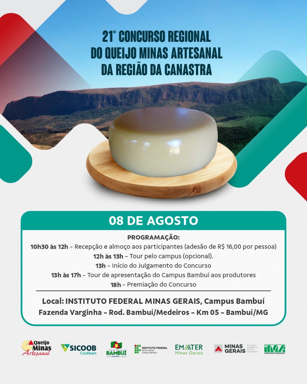 O Sicoob Credibam, instituição financeira cooperativa comprometida com o desenvolvimento regional, é um dos apoiadores do 21º Concurso Regional do Queijo Minas Artesanal da Região da Canastra, que acontece no dia 08 de agosto de 2025, a partir das 13 horas, no Centro de Convenções do IFMG Campus Bambuí. O evento, que é referência na valorização de um dos maiores patrimônios gastronômicos de Minas Gerais, é promovido pelo Governo de Minas Gerais, por meio da EMATER-MG, vinculada à Secretaria de Estado de Agricultura, Pecuária e Abastecimento (SEAPA), e conta com o apoio da Prefeitura Municipal de Bambuí e de outras instituições locais.