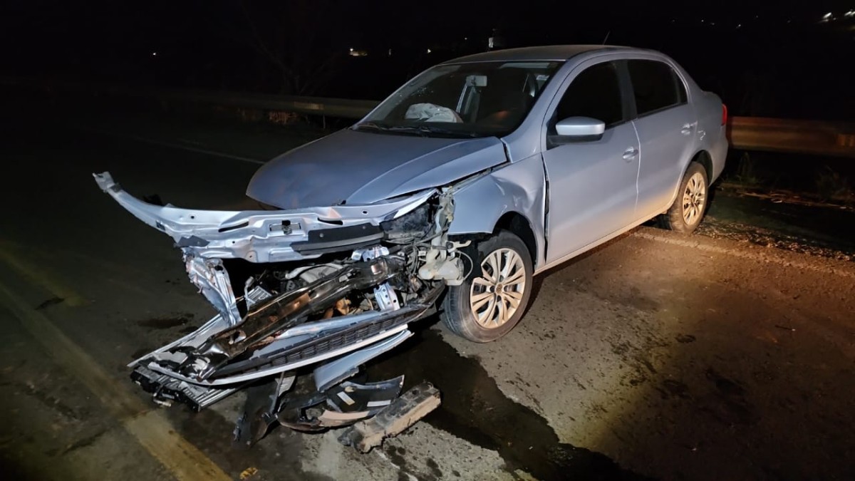 Carro bate em defensa metálica após desviar de carreta na contramão em Bambuí