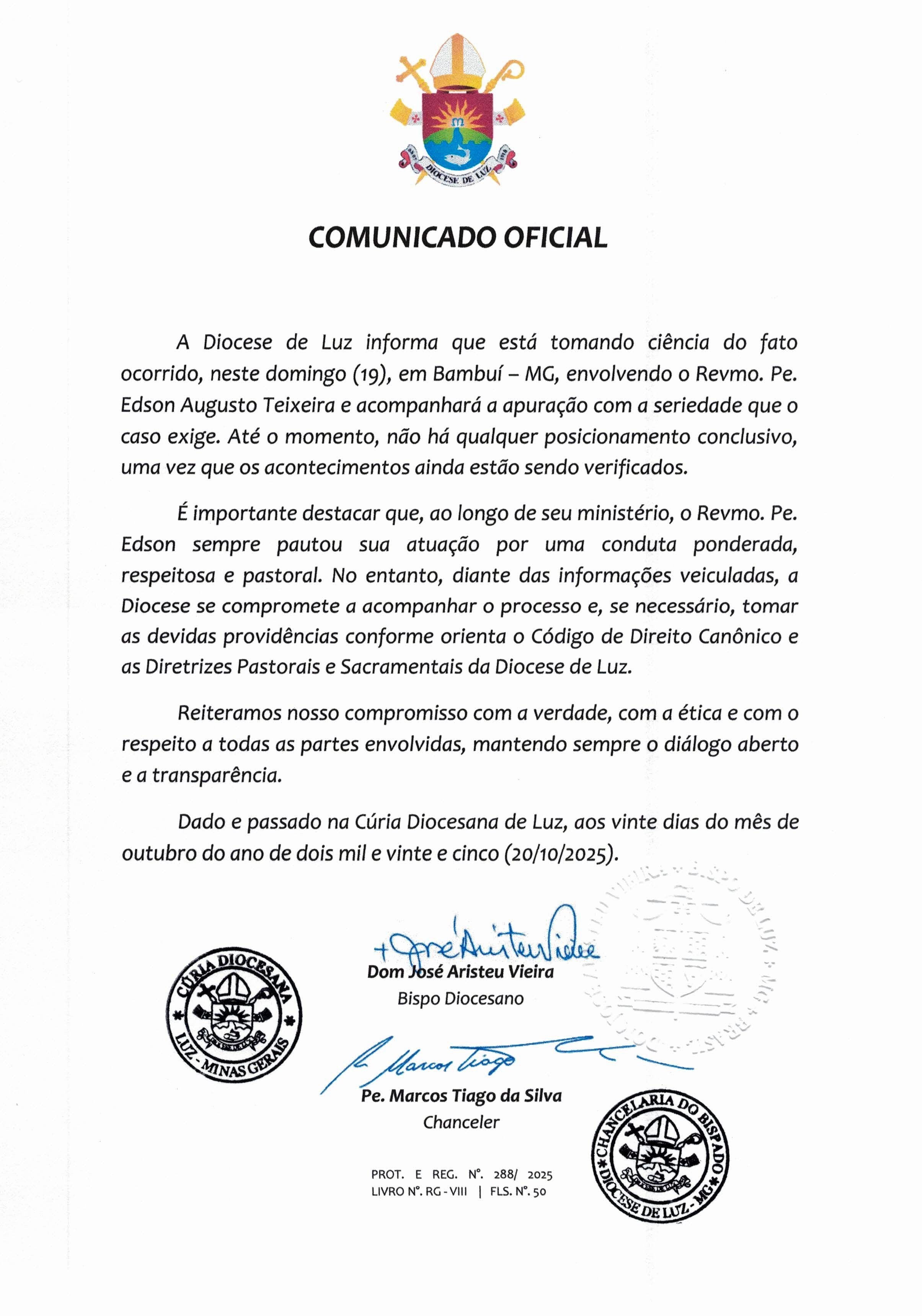 Em comunicado oficial, a Diocese de Luz afirmou que está acompanhando o caso “com a seriedade que ele exige” e que, até o momento, não há posicionamento conclusivo, uma vez que os fatos ainda estão sendo apurados. O documento, assinado pelo bispo diocesano Dom José Aristeu Vieira e pelo chanceler Padre Marcos Tiago da Silva, destaca ainda que o padre Edson sempre pautou sua atuação por uma conduta “ponderada, respeitosa e pastoral”.