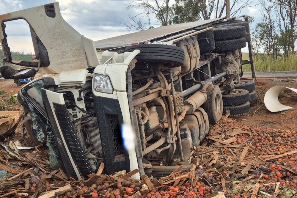Caminhão tomba na BR-262 em Campos Altos; motorista sai ileso e carga é saqueada