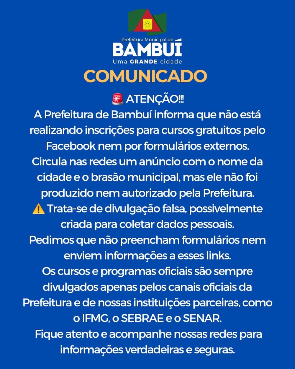 A Prefeitura de Bambuí emitiu um alerta importante nesta segunda-feira (3) após a circulação de um anúncio falso nas redes sociais que utiliza indevidamente o nome e o brasão do município para divulgar supostos cursos gratuitos. A publicação, veiculada no Facebook, afirma oferecer vagas em diversas áreas, como administração, saúde, elétrica e beleza, e direciona os usuários para o preenchimento de um formulário externo.