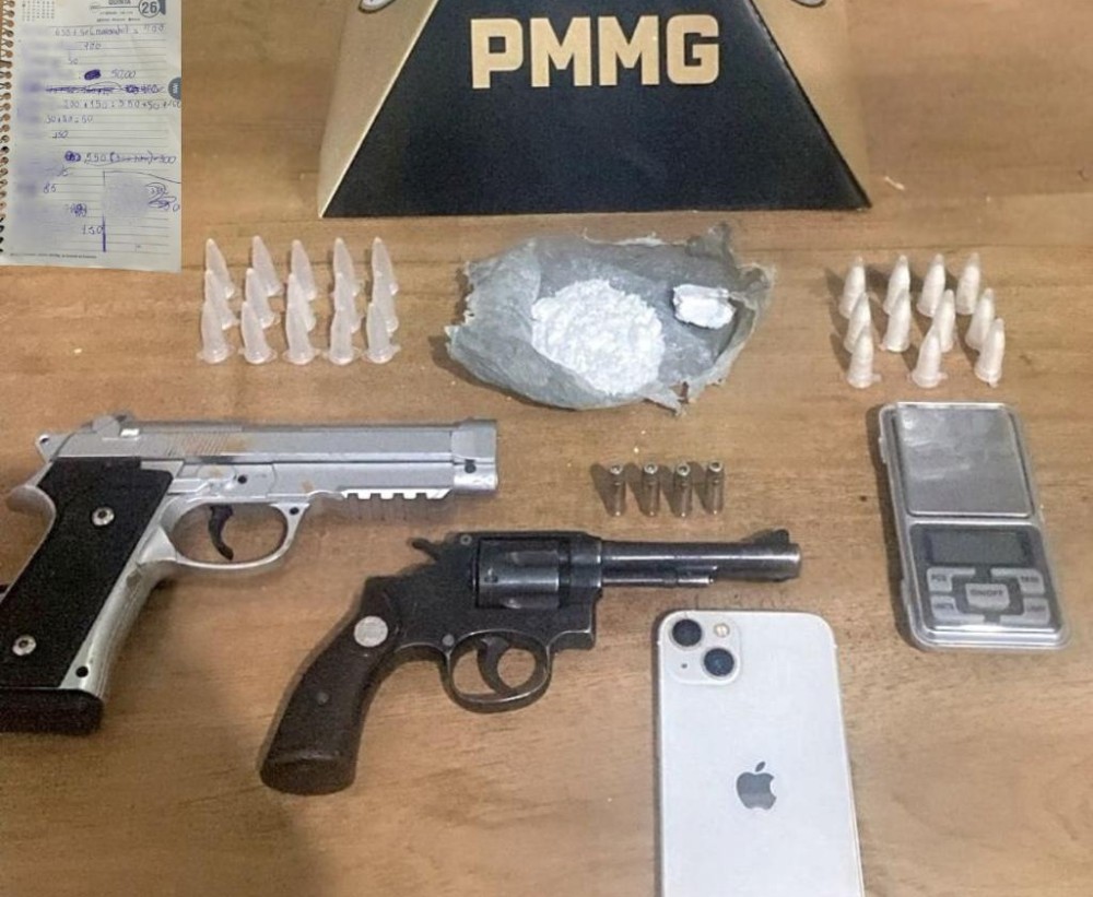 Durante a abordagem e diligências, foram localizados e apreendidos 11 pinos de cocaína já fracionados e prontos para comercialização, além de um invólucro contendo quantidade considerável da mesma substância. Os policiais também encontraram pinos vazios utilizados para o preparo da droga, uma balança de precisão, um caderno com anotações relacionadas ao tráfico, um revólver calibre .32 e um simulacro de arma de fogo.